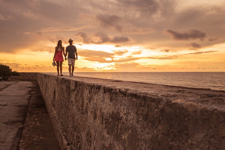 Embark on a fascinating journey through time in a full-day experience that will immerse you in the rich history and heritage of this Caribbean colonial gem. We'll start with a visit to La Popa, where you can admire the breathtaking panoramic view and hear the tales of the convent at its peak. We’ll then continue to San Felipe Castle, a majestic military fortress that has safeguarded the city’s secrets for centuries. Afterward, we explore Getsemaní, a neighbourhood brimming with art and tradition, followed by a traditional lunch. In the afternoon, we visit the walled city, from Las Bóvedas with its crafts, to the Claustro de la Merced, the Palace of the Inquisition, the Gold Museum, and the Emerald Museum, showcasing pre-Colombian marvels and revealing the importance of this precious Colombian gem Finally, the experience culminates on a charming rooftop, enjoying a refreshing drink made with exotic Colombian ingredients while soaking in the stunning view of the city at sunset.